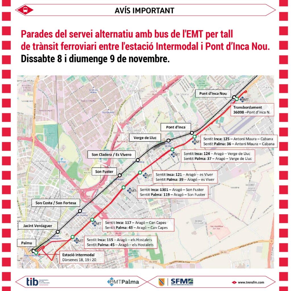En la estación Intermodal, la salida y llegada se realizará desde las dársenas 18, 19 y 20, mientras que en Pont d’Inca Nou, la parada estará junto a la estación de tren. El resto del recorrido ferroviario entre Pont d’Inca Nou y otras estaciones funcionará con normalidad.