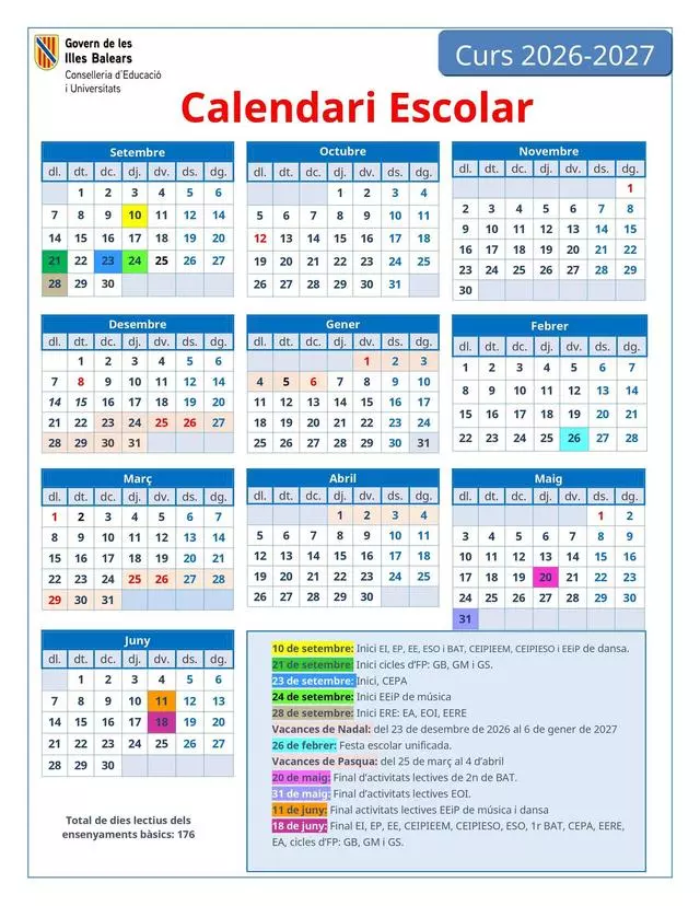 La Conselleria de Educación y Universidades ya ha fijado el calendario escolar del curso 2026-2027. Las clases comenzarán el 10 de septiembre de 2026 y finalizarán el 18 de junio de 2027 para la mayoría de enseñanzas.